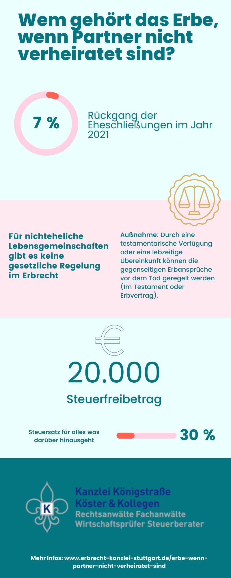 Doch auch das Erbe von nicht verheirateten Paaren unterliegt in Deutschland der Erbschaftssteuer. Der Freibetrag liegt hier bei 20.000 Euro (bei Ehepartnern 500.000 Euro). Alles, was darüber hinausgeht, ist steuerpflichtig und unterliegt einem Steuersatz von 30%.